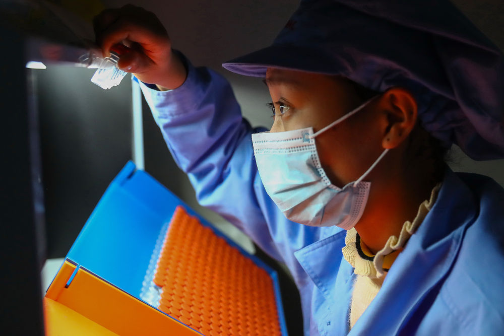 1月6日,科兴中维的工作人员在包装车间对西林瓶包装新冠病毒灭活疫苗进行人工抽检。新华社记者 张玉薇 摄
