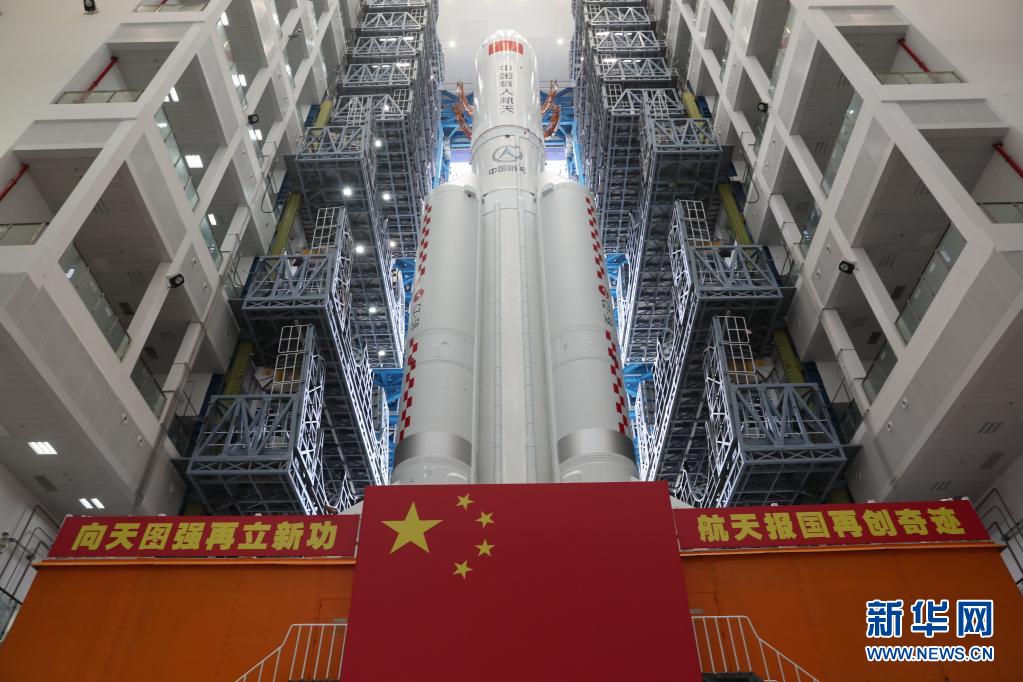 4月23日,空间站天和核心舱与长征五号B遥二运载火箭组合体已转运至发射区。新华社发(郭文彬 摄)