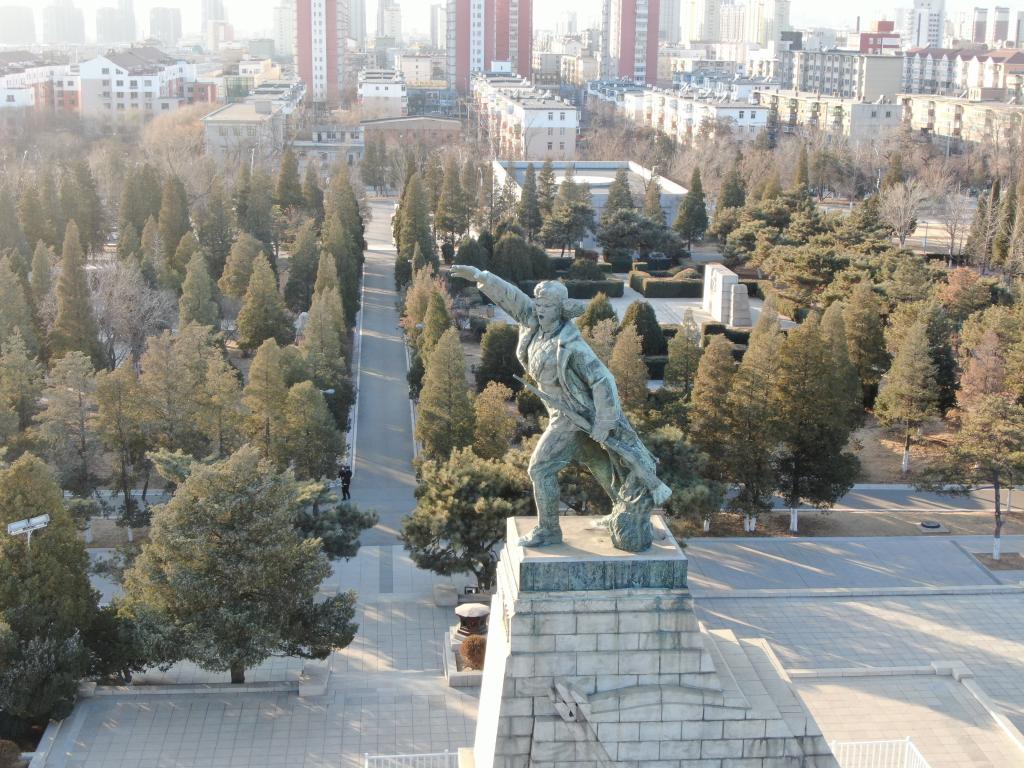 辽沈战役烈士纪念塔上的英烈铜像(无人机照片)。新华社记者杨青 摄