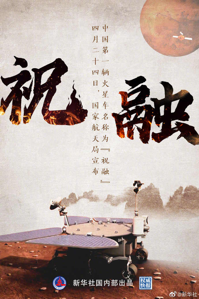 4月24日上午,中国第一辆火星车命名揭晓,名称为“祝融”。祝融是中国上古神话中的火神,火的应用促进了人类文明的发展,驱散黑暗、带来温暖。火也将照亮鸿蒙,指引人类不断探索浩瀚星空,引领人类追逐“永远的光明”。