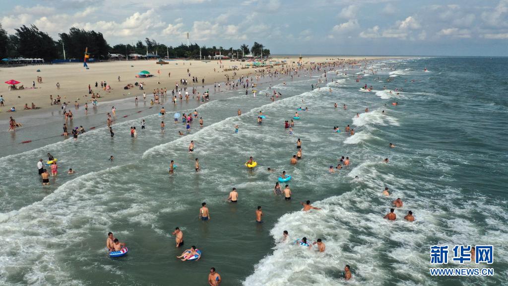 北部湾海域优美的生态环境吸引大批游客前来观光,这是游客在银滩畅游的场景(2019年6月25日摄,无人机照片)。新华社记者 张爱林 摄