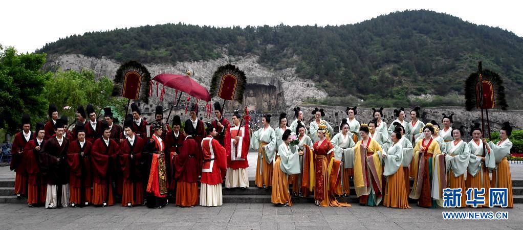 演员在洛阳龙门石窟景区礼佛台演绎龙门石窟《帝后礼佛图》(4月25日摄)。