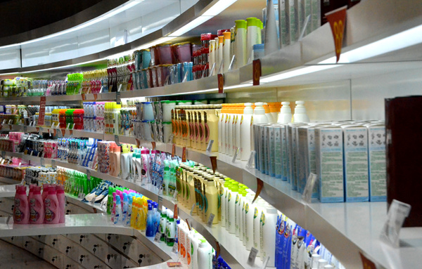 西海岸新区中日韩消费专区体验中心里琳琅满目的免税产品。人民网记者 孙博洋摄