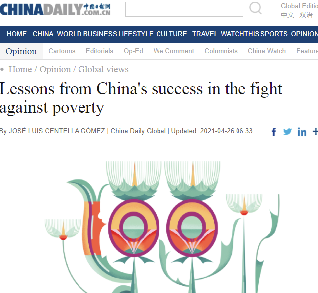中国日报网4月28日电 4月26日,西班牙共产党主席何塞 路易斯 森特利亚在中国日报刊文表示,在中国共产党的领导下,数亿人口成功实现脱贫,这得益于中国共产党始终坚持走中国特色社会主义道路,始终坚持人民的利益高于一切。
