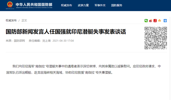 国防部:中国军队已派出舰船协助印尼救援失事潜艇