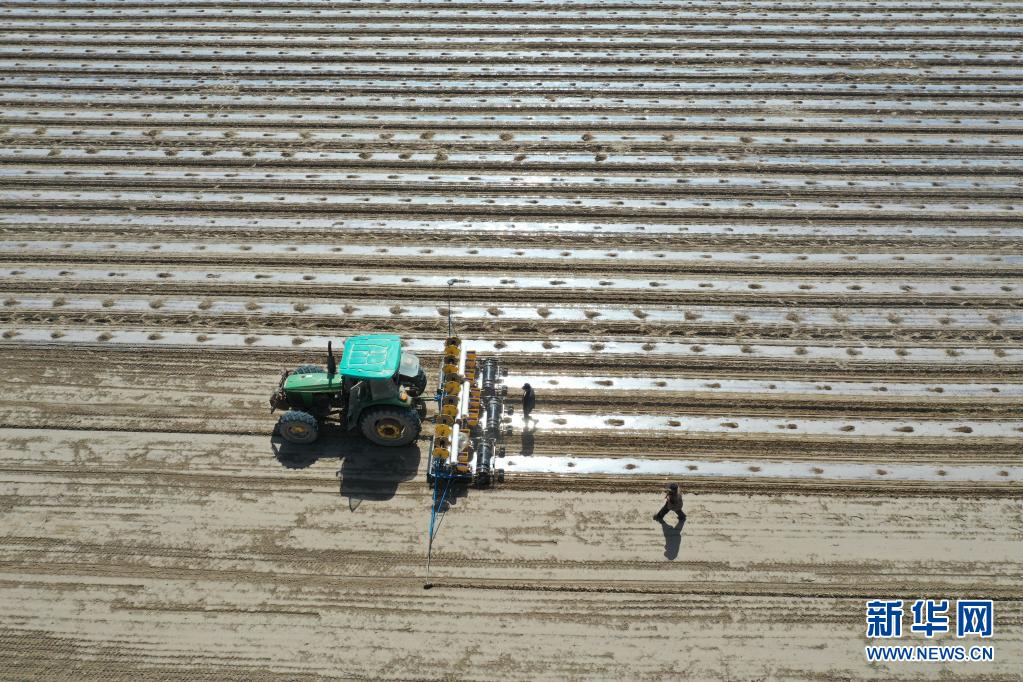 棉农在喀什地区莎车县播种“中棉所127”品种棉花(4月11日摄,无人机照片)。