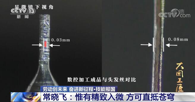 用比头发丝还细0.05毫米的刻刀刀头在直径0.15毫米的金属丝上刻字,这相当于用绣花针给蚂蚁腿缝合,字体内容要用高倍显微镜才能看清,这样的超高技艺是常晓飞运用数控加工技术所完成。而目前,国内能达到如此精度的工匠寥寥无几。