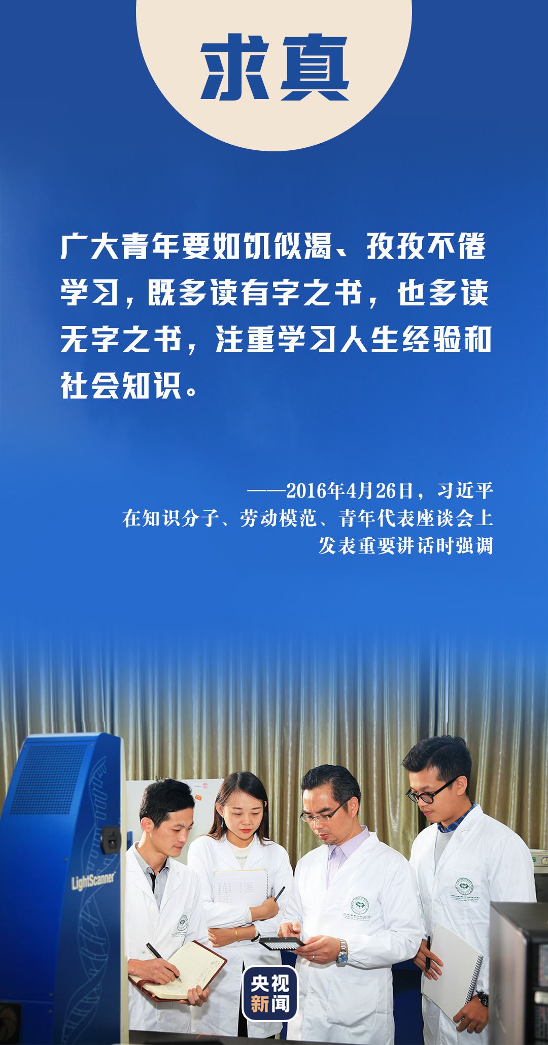 2013年五四青年节,习近平总书记来到中国航天科技集团公司中国空间技术研究院,与青年代表座谈。总书记指出,广大青年要坚持面向现代化、面向世界、面向未来,增强知识更新的紧迫感,如饥似渴学习,既扎实打牢基础知识又及时更新知识,既刻苦钻研理论又积极掌握技能,不断提高与时代发展和事业要求相适应的素质和能力。