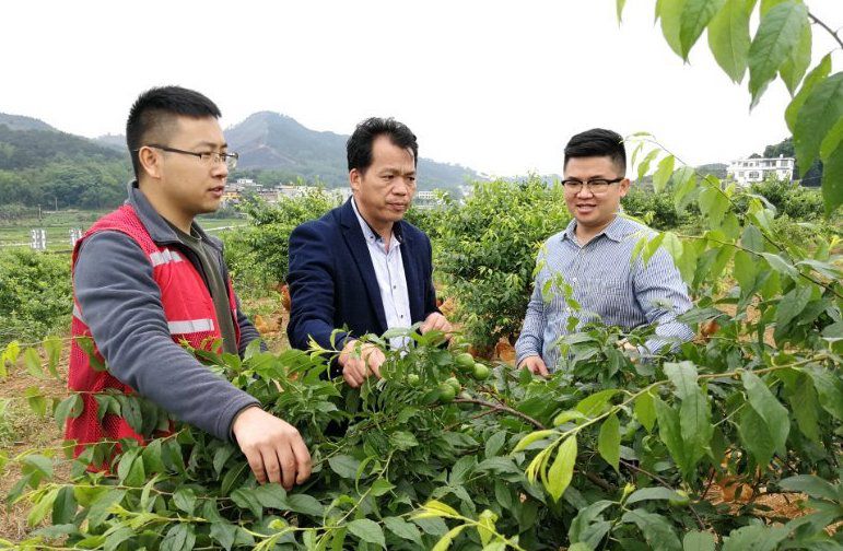 △广西马山县林圩镇伏兴村驻村第一书记周福波(左一)在查看村里已经挂果的三华李。