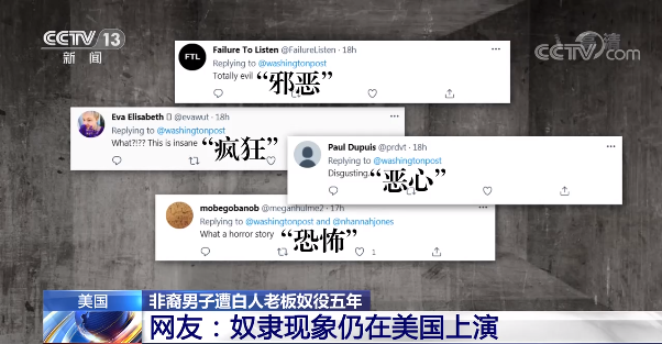还有网友评论称:“50万美元不足以赔偿这名非裔男子,就连工作的报酬也不够。10年的监禁也不足以来惩罚这个残忍的白人老板。”