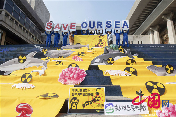 当地时间2020年10月26日,韩国首尔,非政府公民组织在首尔世宗文化会馆举行了一场示威活动,抗议日本福岛第一核电站处理过的放射性水可能被排放到海洋中,敦促日方撤销该计划。图片来源:视觉中国