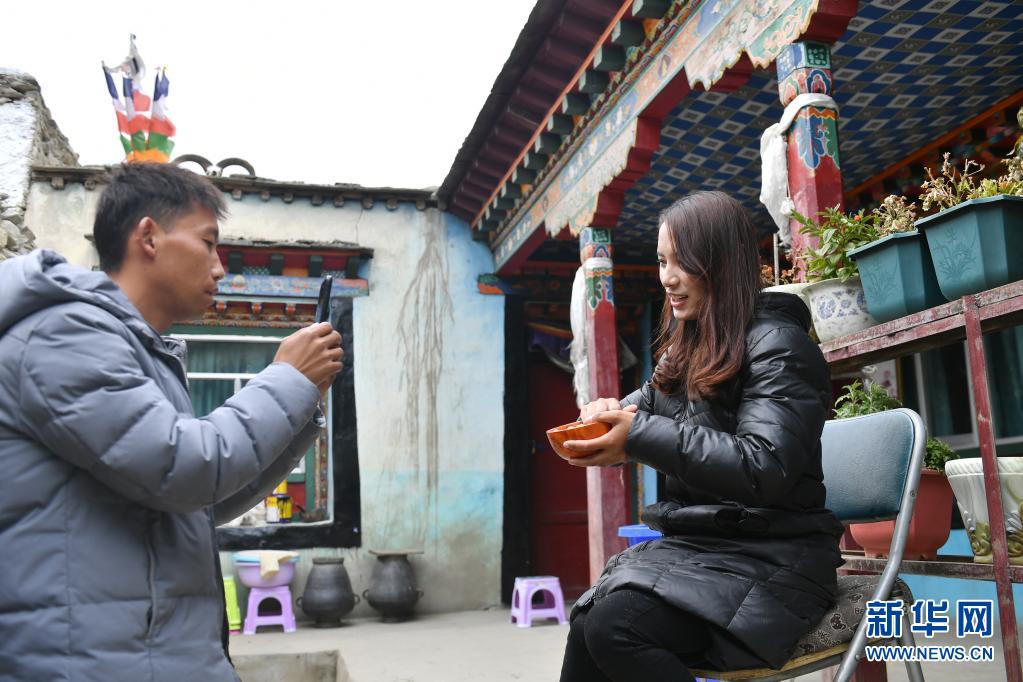 扎西拉姆和丈夫田辉在拍摄制作糌粑的短视频(4月2日摄)。新华社记者 孙瑞博 摄
