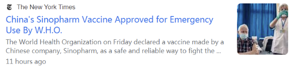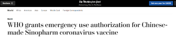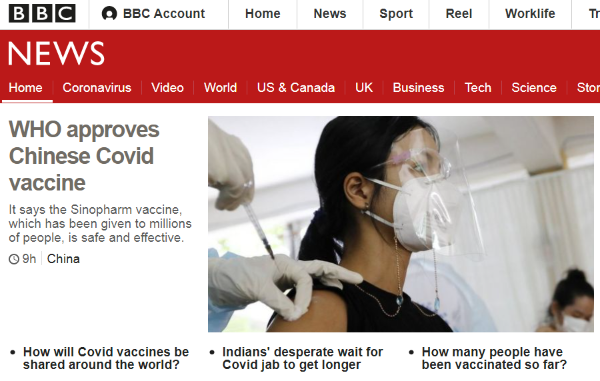 英国广播公司(BBC)报道称,世界卫生组织周五表示,它已验证了国药疫苗的“安全性、有效性和质量”。这是第一款得到世卫组织支持的非西方国家研制的新冠疫苗。中国和其他一些国家已经有数千万人接种了国药疫苗。