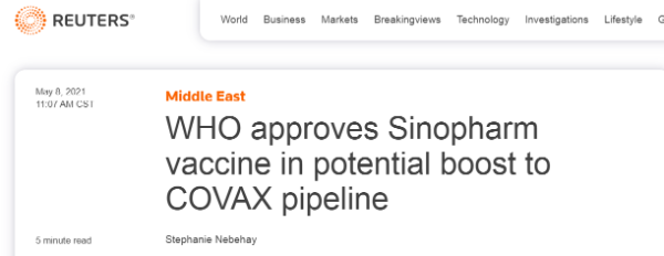 批准国药集团新冠疫苗的决定是世卫组织技术顾问组做出的,该顾问组于4月26日开始开会,审查最新临床数据和国药集团的生产操作。