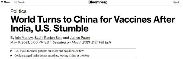 另据美国彭博社5月6日报道称,世界上缺少新冠疫苗的国家越来越倾向向中国寻求帮助,尽管美国一直试图强调自己的疫苗供应能力。