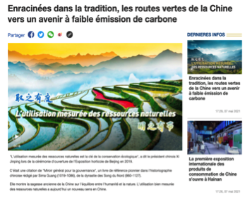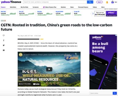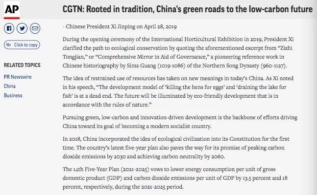 CGTN官网发布英语特稿《经典中的智慧:中国走向低碳未来的绿色道路》,在解读典故的同时,介绍了中国政府在绿色发展领域所采取的积极举措以及一系列成就。目前官网相关报道已经获得了来自美国、英国、加拿大、意大利、澳大利亚、印度、墨西哥、古巴、秘鲁、西班牙、阿根廷等国家和地区的819家海外主流网络媒体转载。代表转载媒体有美联社、雅虎财经、市场观察、晨星网、意大利克罗诺斯通讯社、国际金融时报、澳联社、印度今日商业、印度新德里时报、古巴经济学家报等,累计触达海外受众达5.2亿人次。