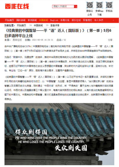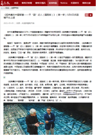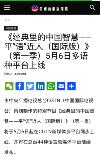 《经典里的中国智慧——平“语”近人(国际版)》(第一季)一上线即引发多家华文媒体高度关注。美国商业新闻网、北欧时报网、日本华商网、欧侨网、葡新报、华人头条、西非在线、非洲时报等网站,以及香港《文汇报》、香港明珠传媒、香港立场传媒、香港观察、粤澳传媒、澳门眀言传媒、大澳热点等境外华文媒体转引转载相关报道。