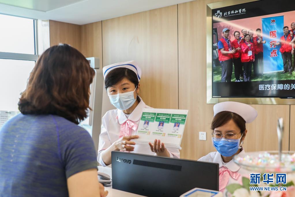 5月11日,北京协和医院南丁格尔护理志愿服务队成员为一名活动参加者提供分诊咨询。
