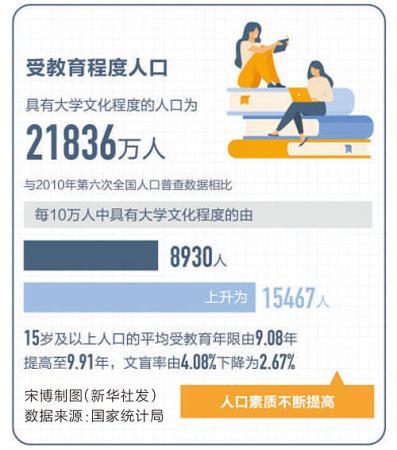 数据显示,2020年全国15岁及以上人口的平均受教育年限为9.91年,比2010年提高0.83年。其中,16-59岁劳动年龄人口平均受教育年限达到10.75年,比2010年的9.67年提高了1.08年。劳动年龄人口中,大专及以上受教育程度的人口占比达到23.61%,也比第六次人口普查时提高了11.27个百分点。