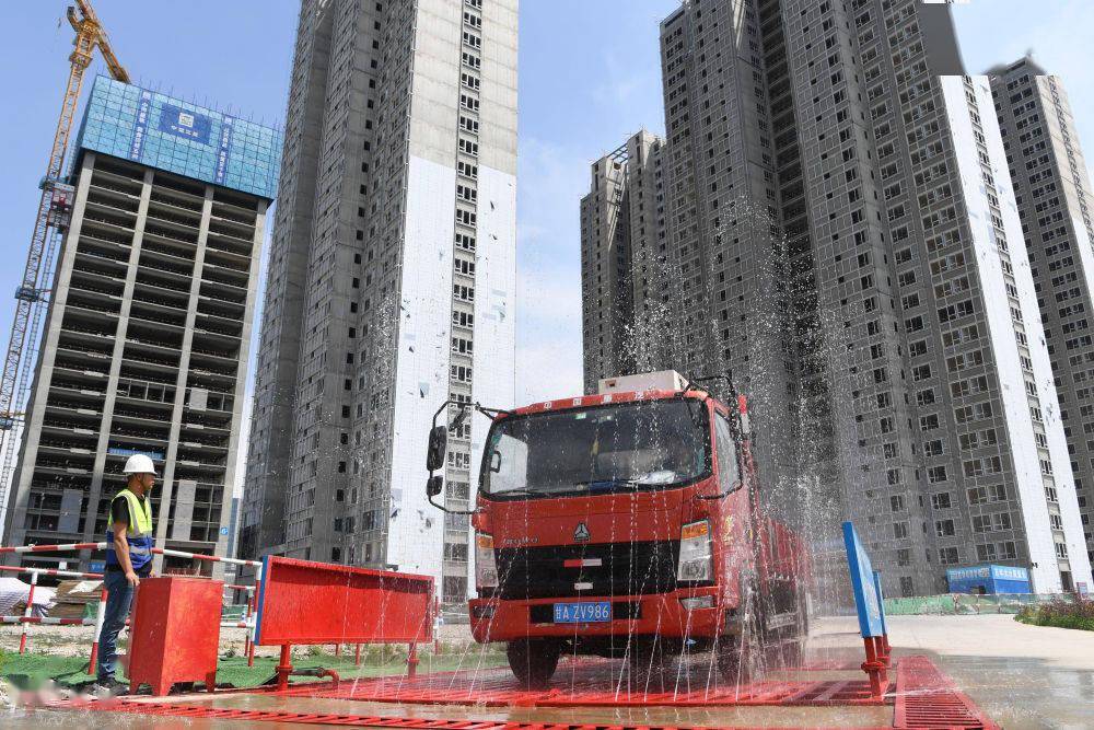 ↑ 在甘肃省兰州市中建三局一处建设工地上,感应式的洗车台利用循环再生水冲洗车辆,并对污水再次回收利用(5月12日摄)。