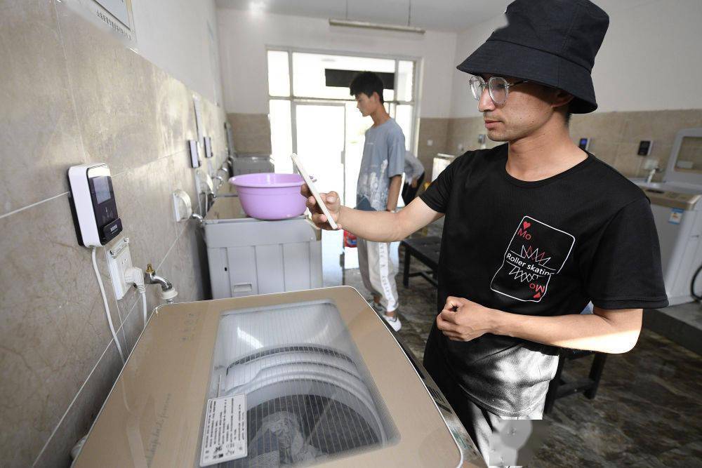 ↑ 宁夏建设职业技术学院学生在洗衣房通过APP扫码进行计量式用水(5月12日摄)。