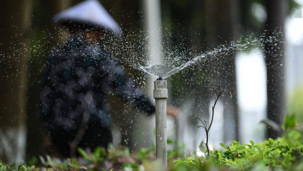 ↑ 在广西钦州市,一名工人在调节节水型喷灌龙头给道路绿化带浇水(5月11日摄)。