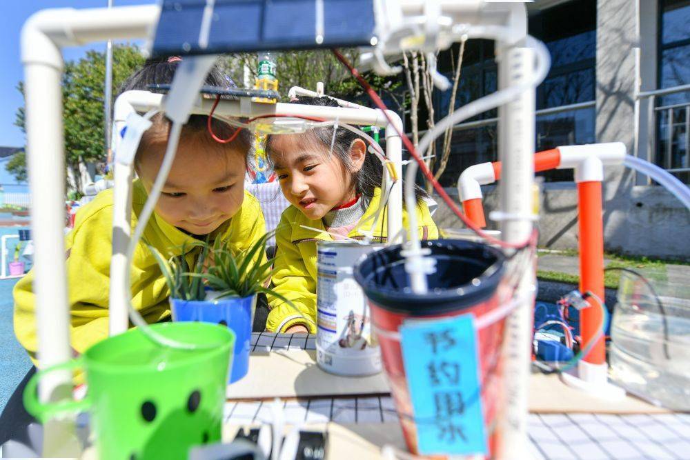 ↑3月22日,浙江省湖州市长兴县泗安镇中心幼儿园的孩子们体验节水环保科技小发明。
