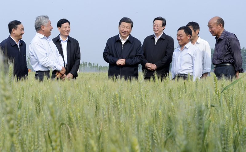 2014年5月9日至10日,中共中央总书记、国家主席、中央军委主席习近平在河南省考察工作。这是5月9日下午,习近平在尉氏县张市镇高标准粮田察看小麦长势。新华社记者 张 铎 摄