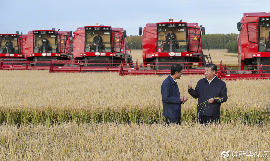 2018年9月,在黑龙江七星农场,习近平走进稻田,拿起一把稻穗,看谷粒、观成色。他说:“中国人要把饭碗端在自己手里,而且要装自己的粮食。”在北大荒精准农业农机中心一楼大厅农产品展台,习近平双手捧起一碗大米,意味深长地说:“中国粮食,中国饭碗。”
