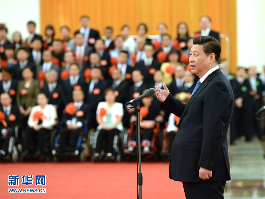 2014年5月16日,习近平在北京人民大会堂会见第五次全国自强模范暨助残先进集体和个人表彰大会受表彰代表。新华社记者 马占成 摄