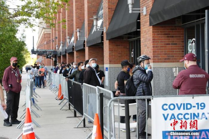 资料图:当地时间5月12日,美国纽约大都会棒球队主场花旗球场新冠疫苗接种点,民众排队接种疫苗。 中新社记者 廖攀 摄