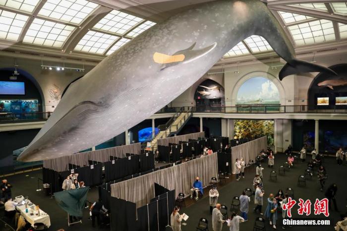 资料图:当地时间4月23日,位于纽约的美国自然历史博物馆开辟米尔斯坦海洋生物大厅为新冠疫苗接种点,为18岁以上的纽约居民接种新冠疫苗。 中新社记者 廖攀 摄