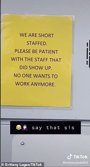 △美国网友照片:得州一家麦当劳餐厅张贴告示,因为“没人愿意再工作了”,人手短缺请顾客耐心等待