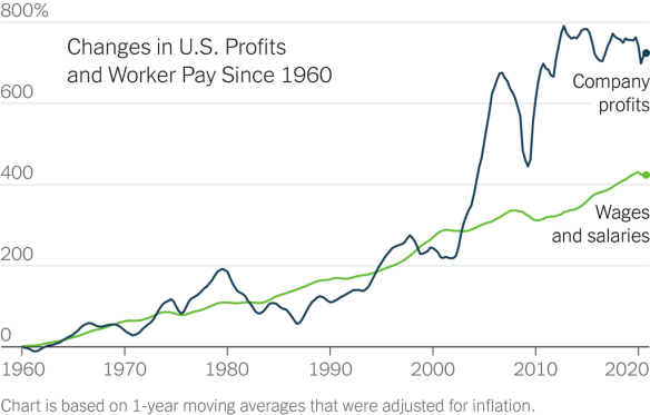 持这种观点的《纽约时报》认为,企业提高工资水平,人们自然就会选择工作,这是市场供求关系决定的。这一判断的依据是,70年代以来,美国人工资收入占GDP的比重就一直在下降,远远赶不上企业利润的增长(下图),而“几十年来,除了富裕阶层以外,其他群体的收入增长速度都很缓慢”。因此,并不是美国经济出了问题,而是“企业高管把给工人较低的薪水当成了理所当然”。