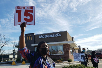 年初以来,美国一些地方出现了争取最低15美元时薪的抗议。一些在餐饮店等低收入岗位工作的劳动者不愿继续受盘剥以及承担疫情风险,要求提高工资(下图)。