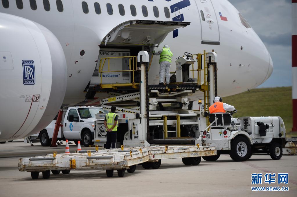 2021年3月16日,在乌拉圭首都蒙得维的亚,工作人员从飞机上卸载中国科兴新冠疫苗。新华社发(尼古拉斯·萨拉亚 摄)