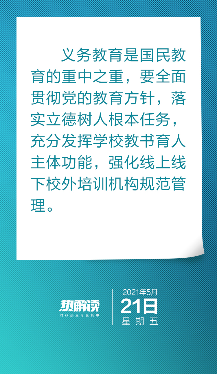 习近平总书记在会议上明确指出,义务教育是国民教育的重中之重,要全面贯彻党的教育方针,落实立德树人根本任务,充分发挥学校教书育人主体功能,强化线上线下校外培训机构规范管理。