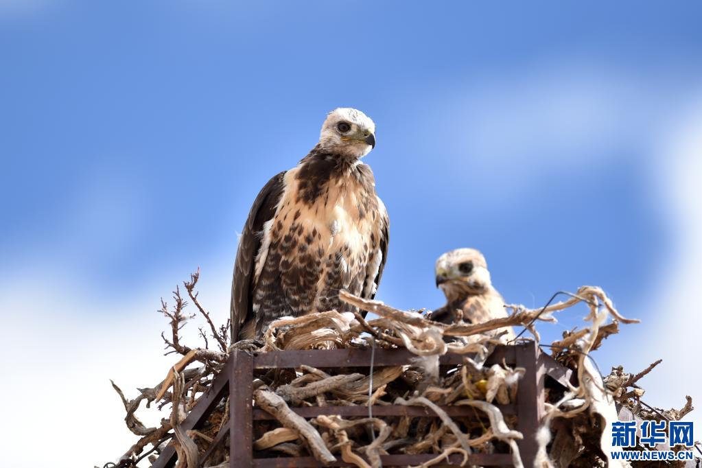 金雕在人工筑的鹰架上栖息。(新华社记者 觉果 摄)