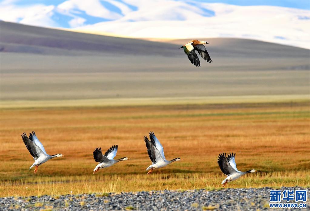 一只赤麻鸭(上)和一群斑头雁在尼玛县那若塘湿地上飞翔。(新华社记者 张汝锋 摄)