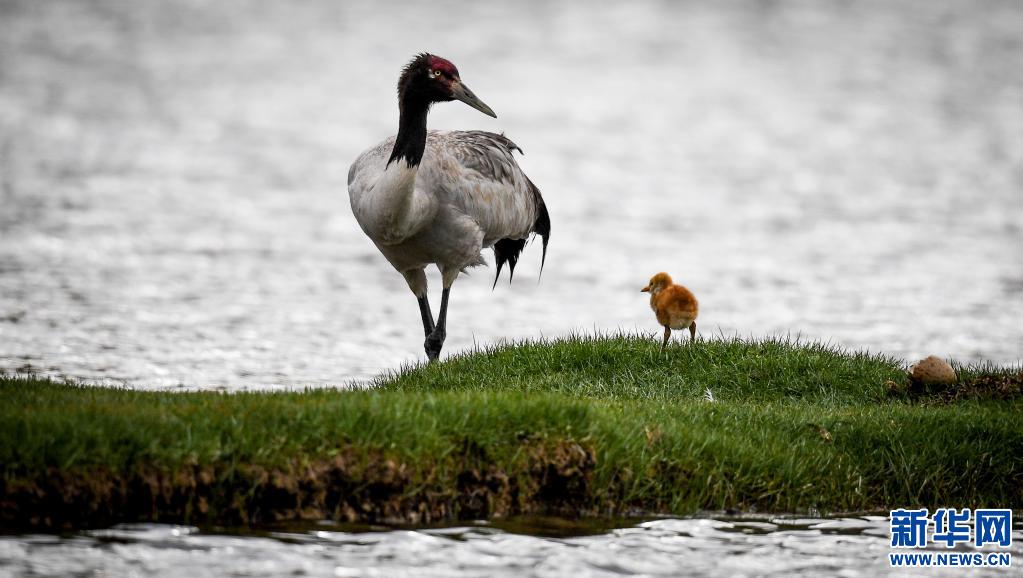成年黑颈鹤带着小黑颈鹤在藏北羌塘草原觅食。(新华社记者 普布扎西 摄)