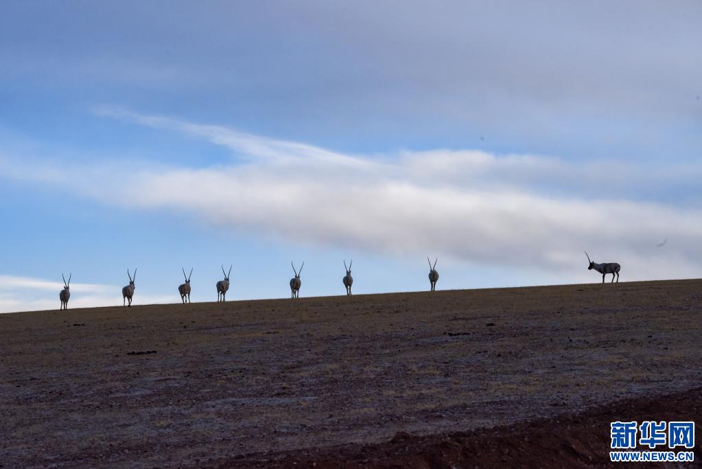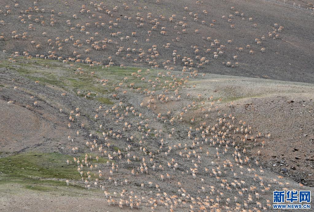 迁徙中的藏羚羊群。(新华社记者 觉果 摄)