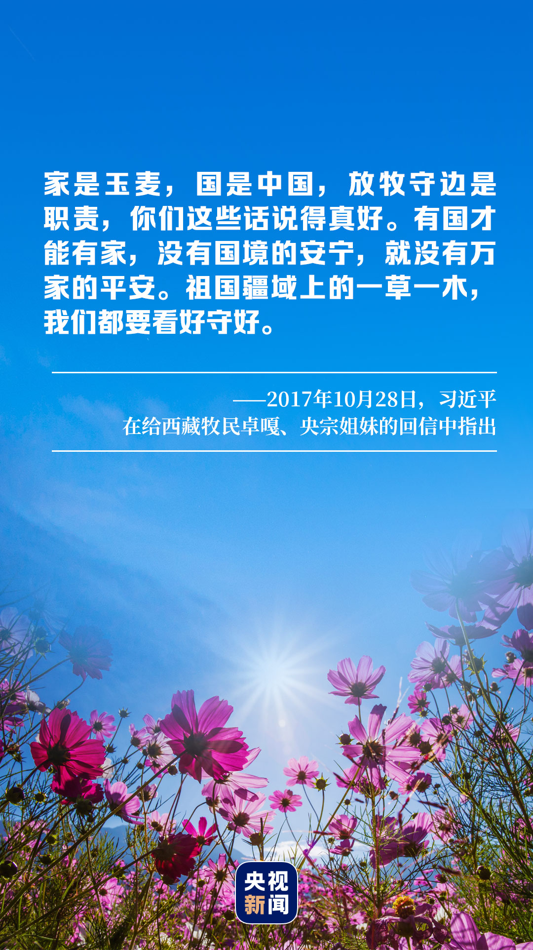 2017年10月,习近平给卓嘎、央宗姐妹回信,称赞两姐妹“家是玉麦,国是中国”的境界,强调“有国才能有家,没有国境的安宁,就没有万家的平安”。
