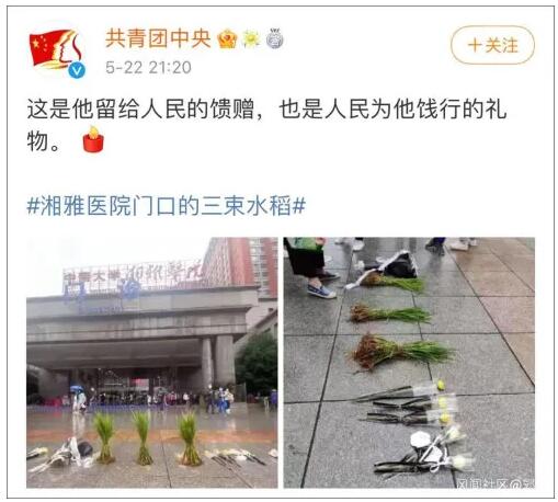 据潇湘晨报报道,在花束中间,还有市民送来三“束”水稻苗,水稻挺立在医院门口,寄托着一种别样的哀思。