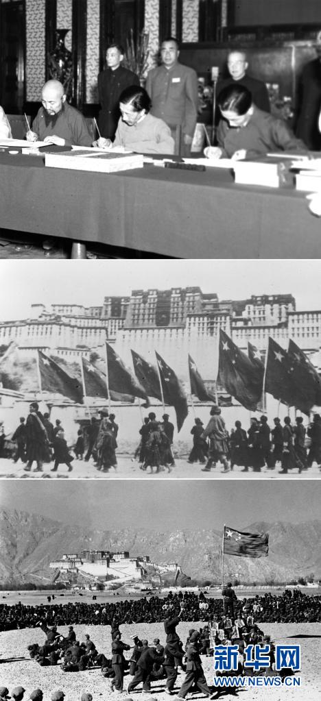 这是一张拼版照片:上图为1951年5月23日,中央人民政府与西藏地方政府在北京签订《关于和平解放西藏办法的协议》(简称“十七条协议”)。上图为西藏地方政府代表在协议上签字;中图为1951年10月26日,西藏地方政府为人民解放军举行了隆重的入城式,拉萨古城飘扬着五星红旗;下图为西藏和平解放后,人民解放军与藏族群众在布达拉宫前欢度新年。