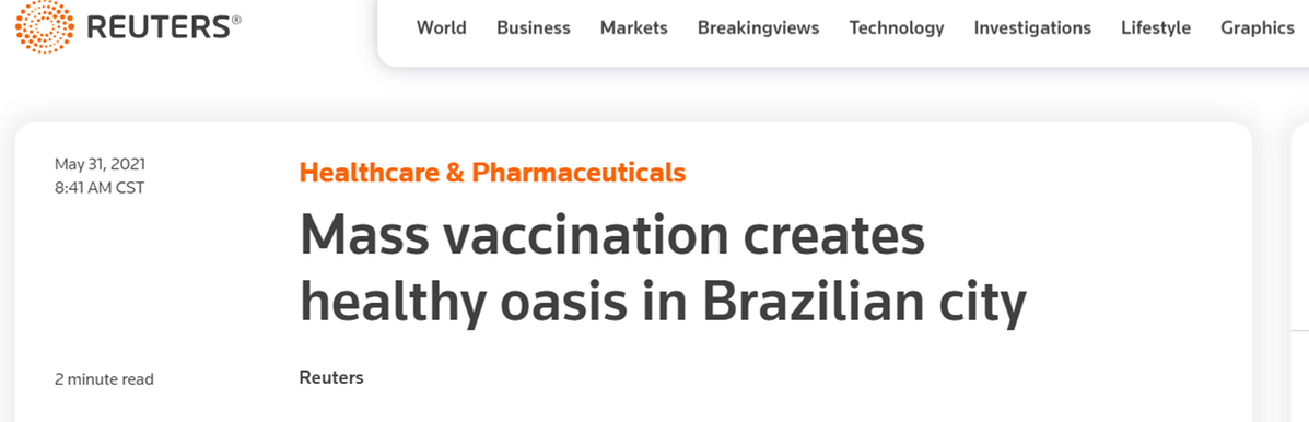 塞拉纳镇官员和居民表示,到目前为止,他们感到结果“令人振奋”。与3月的疫情高峰相比,感染率下降了75%。而在完成接种疫苗的人当中,没有出现死亡病例,这表明科兴疫苗对席卷巴西的P.1变异病毒是有效的。