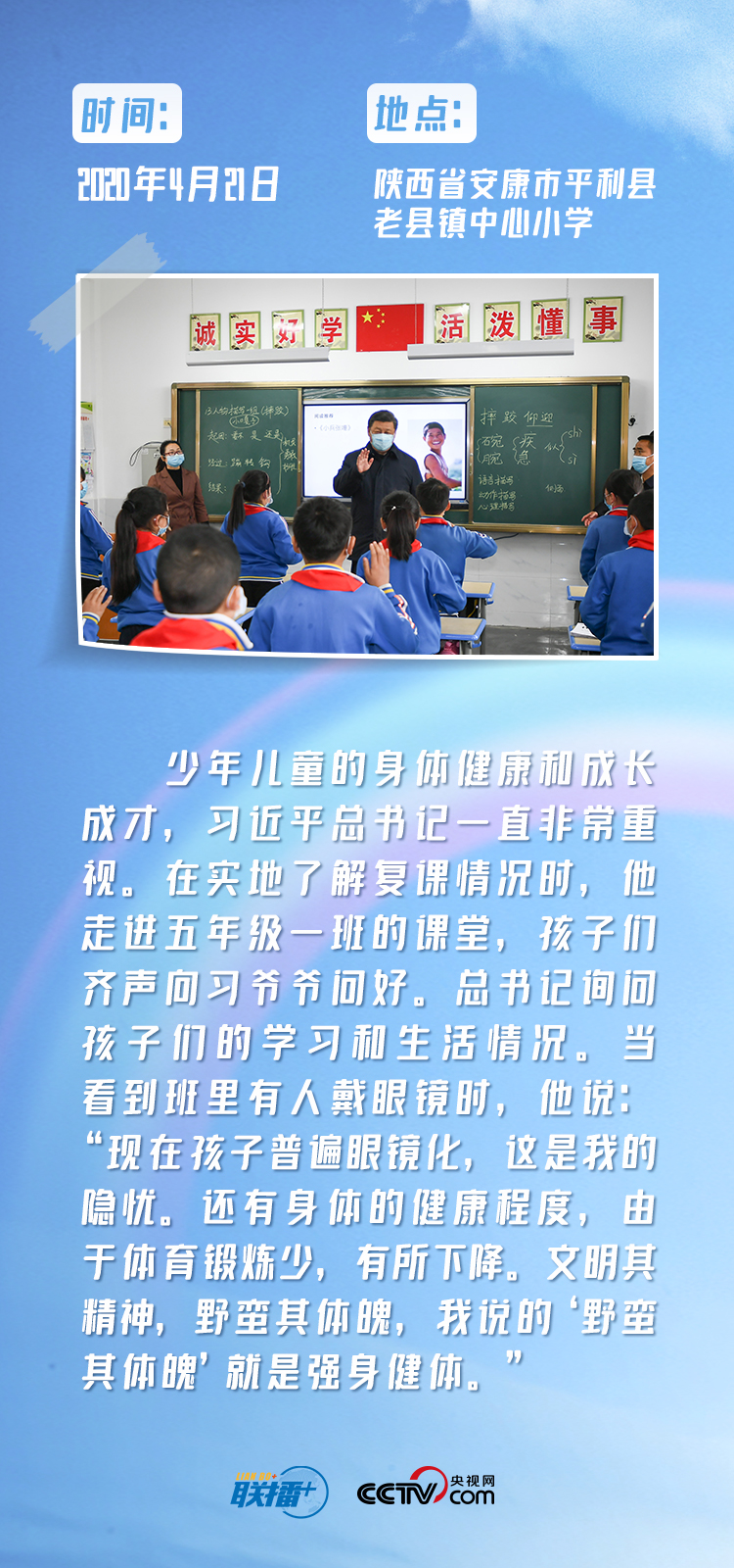 习爷爷的一举一动、一言一行,犹如轻柔的阳光,温暖了孩子们的心灵,照亮着孩子们前行的道路。值此“六一”国际儿童节来临之际,央视网《联播+》带您一起重温那些难忘瞬间。