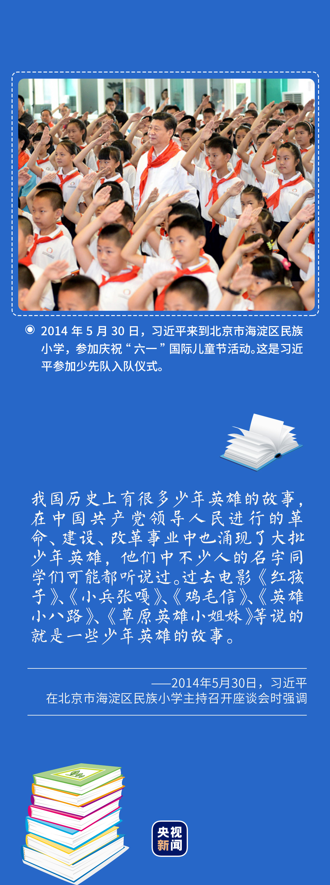 2014年5月30日,习近平总书记来到北京市海淀区民族小学,参加庆祝“六一”国际儿童节活动。在与少先队辅导员、教师、家长、学生代表座谈时,总书记叮嘱,要心有榜样,学习英雄人物、先进人物、美好事物,在学习中养成好的思想品德追求。