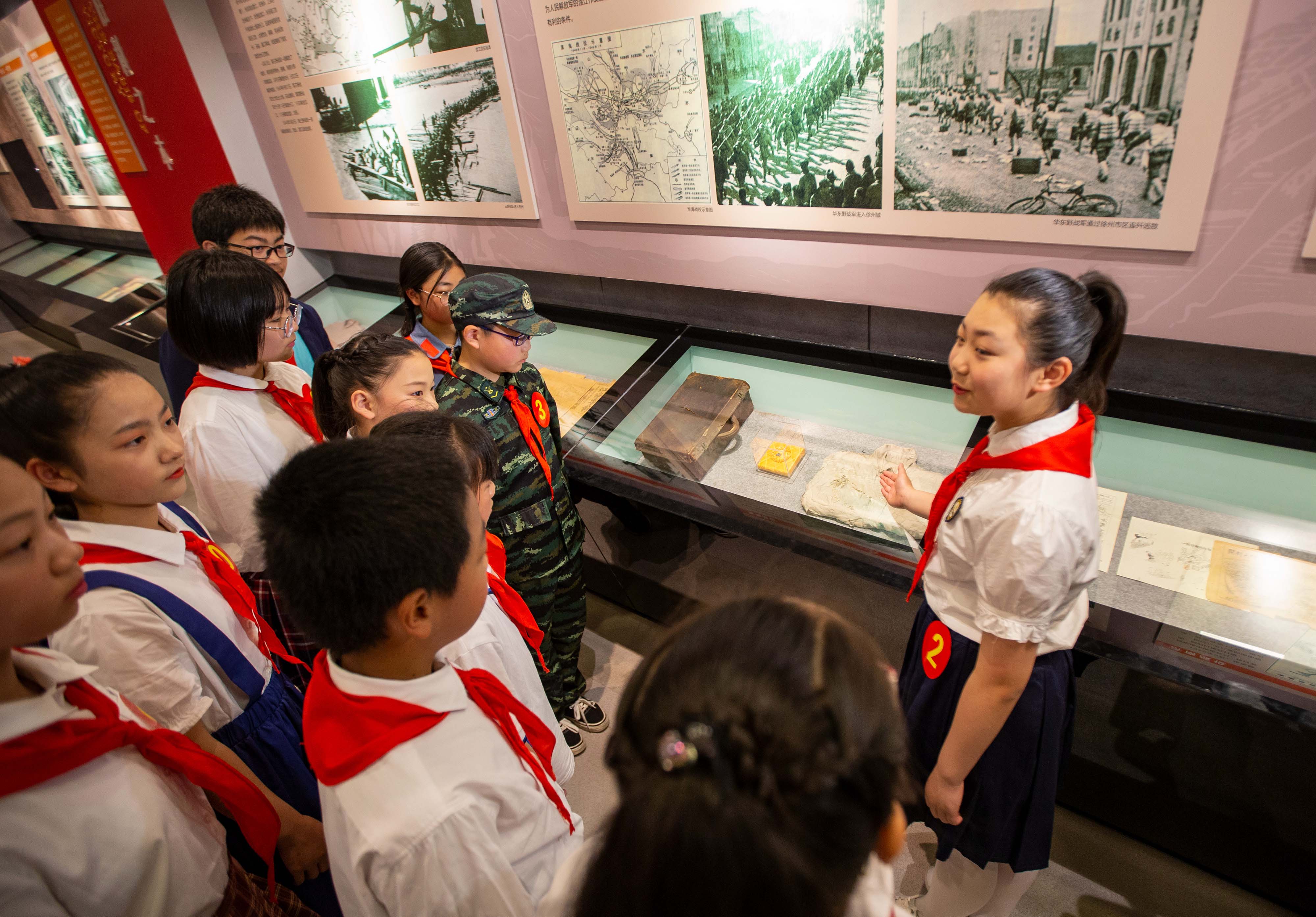 △2021年5月27日,在江苏省南通市海安市的苏中七战七捷纪念馆,小小红色讲解员在给同学们讲述红色故事。