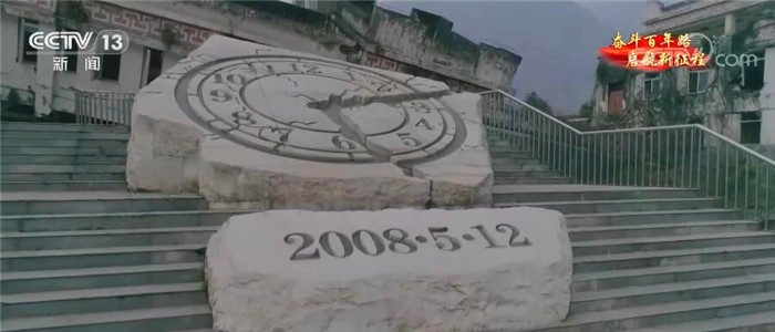 跟随镜头我们来到汶川县,在映秀镇漩口中学遗址,巨大的破碎表盘上,时间永远凝固在地震发生的一刻。教学楼顶的五星红旗在地震中屹立不倒,象征中国人民信念不屈、精神永立。