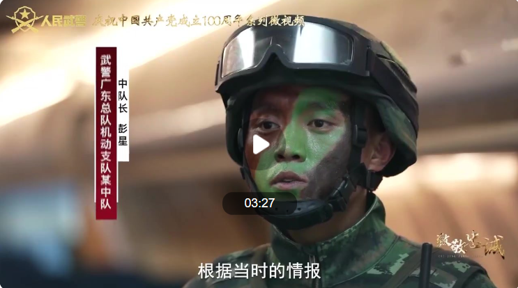 为庆祝中国共产党成立100周年,自2021年6月7日起,人民武警新媒体矩阵连续推出由武警部队政治工作部宣传文化中心制作的40集系列微视频《致敬忠诚》。本期为您介绍武警广东总队机动支队某中队中队长彭星。